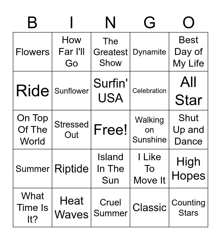 This bingo card has a free space and 36 words: In Summer, Under the Sea, Firework, Sunflower, I Like To Move It, Summer, Surfin' USA, Hawaiin Roller Coaster Ride, Best Day of My Life, I Gotta Feeling, Stressed Out, Dynamite, Party In The U.S.A., Walking on Sunshine, All Star, Flowers, Sunday Best, Riptide, Counting Stars, The Greatest Show, Shut Up and Dance, High Hopes, Heat Waves, What Time Is It?, Cruel Summer, How Far I'll Go, On Top Of The World, Hey Ya!, Celebration, Ride, Better When I'm Dancin', Bye Bye Bye, Classic, Island In The Sun, Call Me Maybe and Shake It Off.
