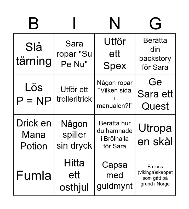 This bingo card has 16 words: Hitta ett osthjul, Utropa en skål, Utför ett Spex, Slå tärning, Drick en Mana Potion, Sara ropar "Su Pe Nu", Berätta hur du hamnade i Brölhalla för Sara, Capsa med guldmynt, Lös P = NP, Utför ett trolleritrick, Fumla, Berätta din backstory för Sara, Någon spiller sin dryck, Ge Sara ett Quest, Någon ropar "Vilken sida i manualen?!" and Få loss (vikinga)skeppet som gått på grund i Norge.
