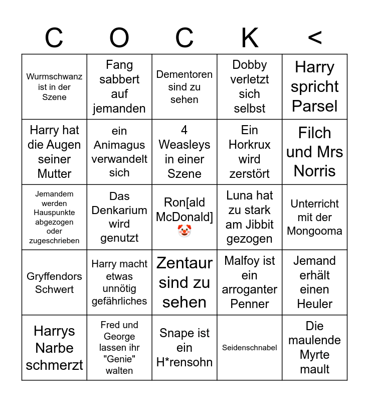 This bingo card has 50 words: Hermine nutzt ihr großes Gehirn, Ron[ald McDonald]🤡, Fresh D predigt seine Weisheit, Snape ist ein H*rensohn, Harry macht etwas unnötig gefährliches, Hagrid ist ein Idiot, Fang sabbert auf jemanden, Harry ist der großzügige Bre 💰, Harry hat die Augen seiner Mutter, Jemand ist im Krankenflügel zusehen, ein Animagus verwandelt sich, Dobby verletzt sich selbst, Jemand erhält einen Heuler, Malfoy ist ein arroganter Penner, Der fahrende Ritter ist zusehen, Harrys Eule "Hermine" ist auch dabei, 4 Weasleys in einer Szene, Luna hat zu stark am Jibbit gezogen, Jemand hat "Viel-Saft"-Trank getrunken, Harry spricht Parsel, Das Denkarium wird genutzt, Seidenschnabel, Wurmschwanz ist in der Szene, Ein Horkrux wird zerstört, Ein Thestral ist in der Szene, Die maulende Myrte mault, Filch und Mrs Norris, Hermine wird beleidigt, Dementoren sind zu sehen, Zentaur sind zu sehen, Ron frisst wie ein Schwein, pubertäres Drama, Die Gang gönnt sich lecker Butterbierchen, Mr Weasley ist von Muggletech begeistert, Fred und George lassen ihr "Genie" walten, Schokofrosch, Quaffel, Geister, Seamus Finnigan jagd sich selbst in die Luft, Unterricht mit der Mongooma, Die Dursleys sind ekelhaft zu Harry, Jemand liest den Tagespropheten, Harry zaubert Expelliarmus, Jemand stirbt on Screen, Harrys Narbe schmerzt, Jemandem werden Hauspunkte abgezogen oder zugeschrieben, Nagini schlängelt sich durch die Szene, Unterwegs in der Winkelgasse, Gryffendors Schwert and Unterricht in der Verteidigung gegen die dunklen Künste.