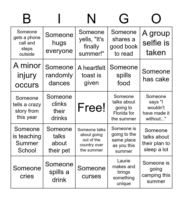 This bingo card has a free space and 24 words: Someone talks about their pet, Someone spills a drink, A heartfelt toast is given, Someone cries, A group selfie is taken, Someone gets a phone call and steps outside, A minor injury occurs, Someone hugs everyone, Someone talks about going to Florida for the summer, Someone talks about going out of the country over the summer, Someone spills food, Someone tells a crazy story from this year, Someone is going to the same place as you this summer, Someone talks about their plan to sleep a lot, Someone randomly dances, Laurie makes and brings something unique, Someone says "I wouldn't have made it without...", Someone yells, "It's finally summer!", Someone has cake, Someone clinks their drinks, Someone is going camping this summer, Someone is teaching Summer School, Someone shares a good book to read and Someone curses.