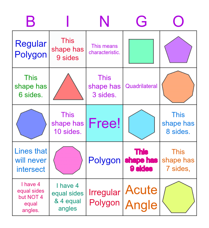 This bingo card has 8 images, a free space and 16 words: I have 4 equal sides & 4 equal angles, This shape has 3 sides., I have 4 equal sides but NOT 4 equal angles., Regular Polygon, This shape has 6 sides., This shape has 9 sides, Polygon, Quadrilateral, This shape has 9 sides, This shape has 7 sides,, Acute Angle, This shape has 8 sides., This means characteristic., This shape has 10 sides., Lines that will never intersect and Irregular Polygon.