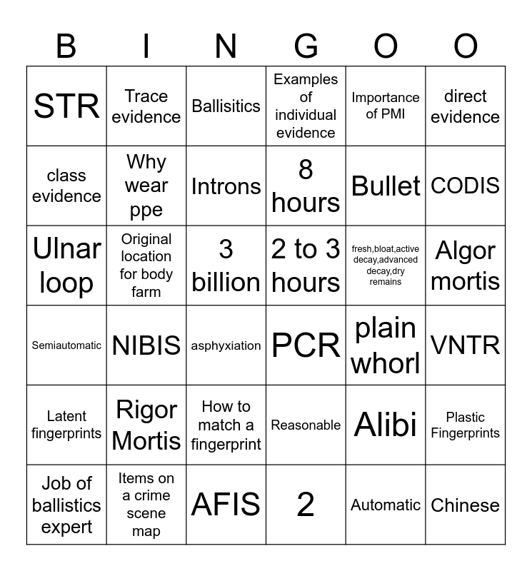 This bingo card has 46 words: Free!, Ulnar loop, double loop whorl, plain whorl, fresh,bloat,active decay,advanced decay,dry remains, Reasonable, Trace evidence, individual evidence, direct evidence, Items on a crime scene map, class evidence, Examples of individual evidence, NIBIS, Semiautomatic, Automatic, How to match a fingerprint, Why wear ppe, Original location for body farm, Body farm purpose, Importance of PMI, CODIS, VNTR, STR, Introns, Gel Electrophoresis, 8 hours, asphyxiation, Exanguination, Algor mortis, 2 to 3 hours, 12 hours, Rigor Mortis, 2, Chinese, AFIS, PCR, 3 billion, Job of ballistics expert, Liver, Alibi, Latent fingerprints, Ballisitics, Bullet, Patent Prints, Plastic Fingerprints and Trajectory.