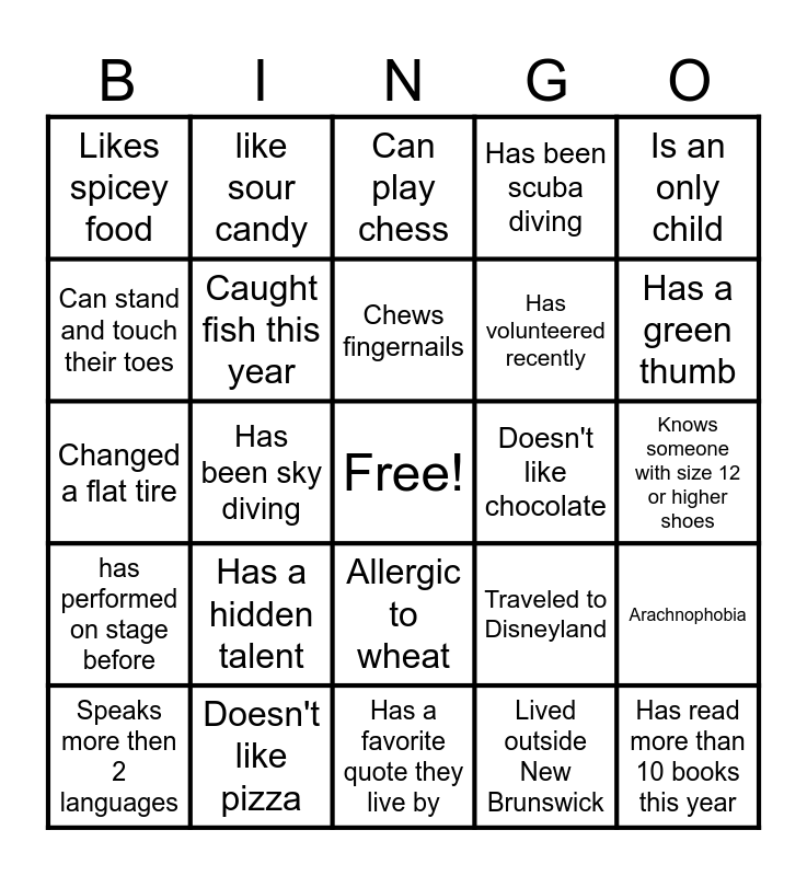 This bingo card has a free space and 24 words: Has a hidden talent, Doesn't like pizza, Chews fingernails, Speaks more then 2 languages, Is an only child, Likes spicey food, Can stand and touch their toes, like sour candy, Doesn't like chocolate, Allergic to wheat, Has volunteered recently, Changed a flat tire, Traveled to Disneyland, Arachnophobia, Caught fish this year, Lived outside New Brunswick, Knows someone with size 12 or higher shoes, Can play chess, Has a green thumb, Has been sky diving, Has read more than 10 books this year, has performed on stage before, Has been scuba diving and Has a favorite quote they live by.