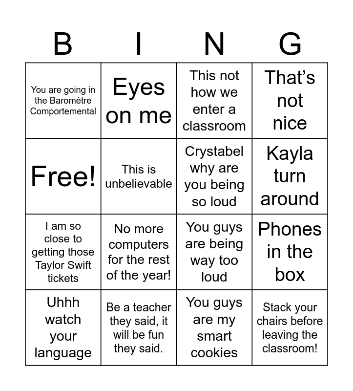 This bingo card has 16 words: Be a teacher they said, it will be fun they said., Phones in the box, This not how we enter a classroom, You are going in the Baromètre Comportemental, I am so close to getting those Taylor Swift tickets, Eyes on me, You guys are being way too loud, You guys are my smart cookies, Free!, This is unbelievable, Uhhh watch your language, That’s not nice, No more computers for the rest of the year!, Kayla turn around, Crystabel why are you being so loud and Stack your chairs before leaving the classroom!.