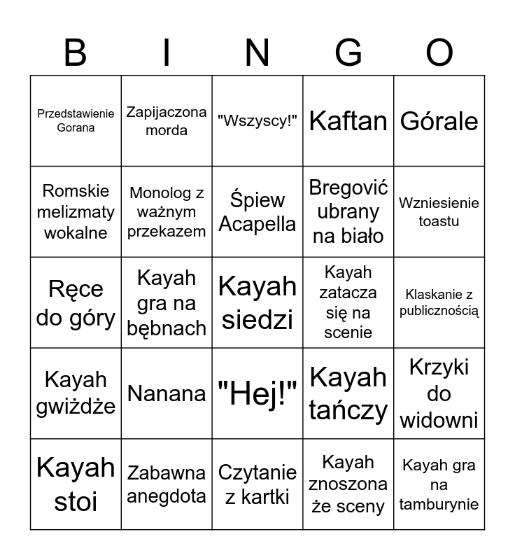 This bingo card has 25 words: Kayah gwiżdże, Zabawna anegdota, Kayah siedzi, Kayah znoszona że sceny, Górale, Przedstawienie Gorana, Zapijaczona morda, "Wszyscy!", Kayah zatacza się na scenie, Krzyki do widowni, Romskie melizmaty wokalne, Monolog z ważnym przekazem, Czytanie z kartki, Kayah tańczy, Wzniesienie toastu, Kayah stoi, Kayah gra na bębnach, Śpiew Acapella, Bregović ubrany na biało, Klaskanie z publicznością, Ręce do góry, Nanana, "Hej!", Kaftan and Kayah gra na tamburynie.