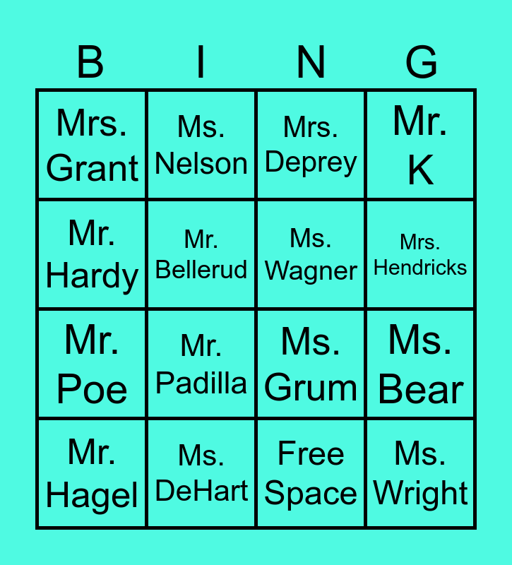 This bingo card has 17 words: Free Space, Mr. Hagel, Mrs. Deprey, Mrs. Grant, Mr. Padilla, Mr. K, Ms. Bear, Ms. Wagner, Mrs. Hendricks, Mr. Bellerud, Ms. DeHart, Ms. Grum, Mr. Hardy, Ms. Nelson, Mr. Poe, Ms. Zimmerman and Ms. Wright.