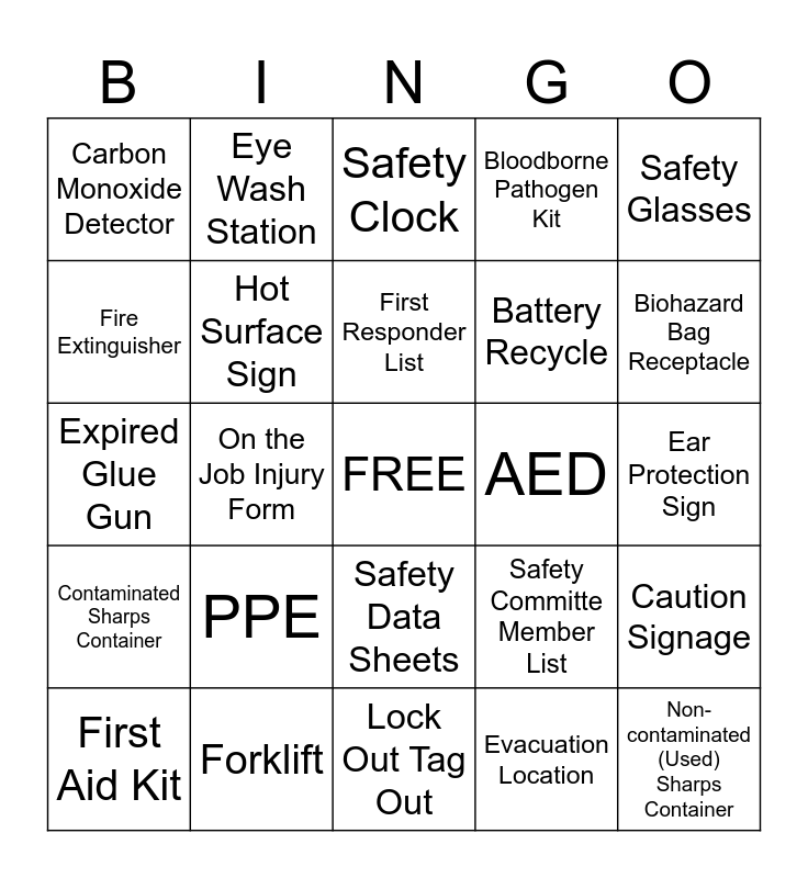This bingo card has a free space and 24 words: PPE, Forklift, First Responder List, First Aid Kit, Safety Glasses, Carbon Monoxide Detector, Fire Extinguisher, Eye Wash Station, AED, Safety Data Sheets, Battery Recycle, Expired Glue Gun, Safety Committe Member List, Caution Signage, Hot Surface Sign, Evacuation Location, Ear Protection Sign, Safety Clock, Biohazard Bag Receptacle, On the Job Injury Form, Non-contaminated (Used) Sharps Container, Contaminated Sharps Container, Bloodborne Pathogen Kit and Lock Out Tag Out.