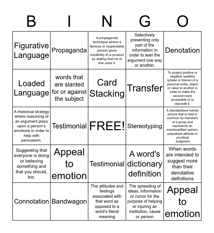 This bingo card has a free space and 24 words: Appeal to emotion, Bandwagon, Card Stacking, Connotation, Denotation, Figurative Language, Loaded Language, Propaganda, Stereotyping, Testimonial, Transfer, A rhetorical strategy where reasoning of an argument plays upon a person’s emotions in order to help with persuasion., A word's dictionary definition, When words are intended to suggest more than their denotative definitions, words that are slanted for or against the subject, The spreading of ideas, information or rumor for the purpose of helping or injuring an institution, cause or person, A standardized mental picture that is held in common by members of a group and represents an oversimplified opinion, prejudiced attitude or uncritical Judgment, A propaganda technique where a famous or respectable person gives credibility to a product by stating that he or she uses it., To project positive or negative qualities (praise or blame) of a personal entity, object or value to another in order to make the second more acceptable or to discredit it., Testimonial, Appeal to emotion, Suggesting that everyone is doing or believing something and that you should, too., Selectively presenting only part of the information in order to lean the argument one way or another. and The attitudes and feelings associated with that word as opposed to a word’s literal meaning.