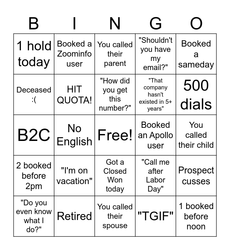 This bingo card has a free space and 24 words: "I'm on vacation", Retired, "How did you get this number?", "Do you even know what I do?", Booked a sameday, 1 hold today, Deceased :(, Booked a Zoominfo user, Booked an Apollo user, Got a Closed Won today, "That company hasn't existed in 5+ years", B2C, "Call me after Labor Day", Prospect cusses, HIT QUOTA!, "TGIF", You called their child, You called their parent, 500 dials, No English, 1 booked before noon, 2 booked before 2pm, "Shouldn't you have my email?" and You called their spouse.