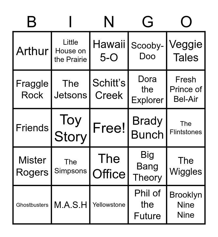 This bingo card has a free space and 40 words: Frasier, Friends, Jaws, The Jetsons, M.A.S.H, The Office, Schitt’s Creek, Super Mario, Veggie Tales, Mister Rogers, Toy Story, Scooby-Doo, Brooklyn Nine Nine, The Flintstones, Brady Bunch, The Simpsons, Kim Possible, Arthur, Lassie, Hawaii 5-O, The Wiggles, Phil of the Future, Dora the Explorer, Fraggle Rock, Murdoch Mysteries, Looney Tunes, Pokemon, I Dream of JEannie, Star Wars, Barney, King of the Hill, Ghostbusters, Harry Potter, Big Bang Theory, Fresh Prince of Bel-Air, Yellowstone, Skinnamarink, The Andy Griffith Show, Little House on the Prairie and The Monkees.
