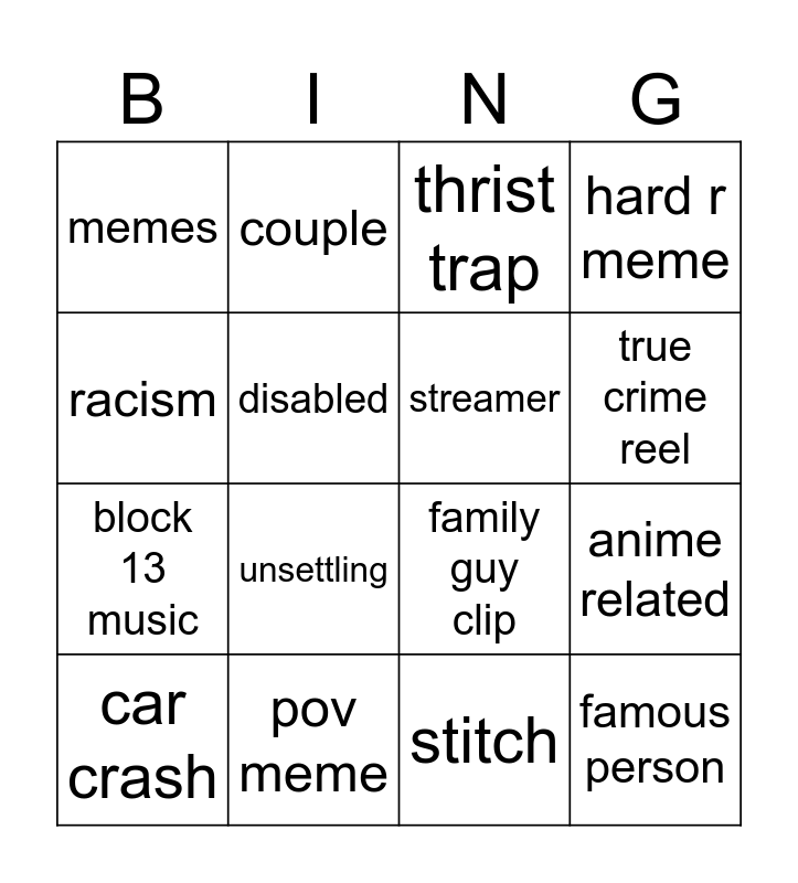 This bingo card has 16 words: pov meme, anime related, thrist trap, memes, block 13 music, couple, family guy clip, stitch, racism, disabled, car crash, hard r meme, unsettling, true crime reel, streamer and famous person.
