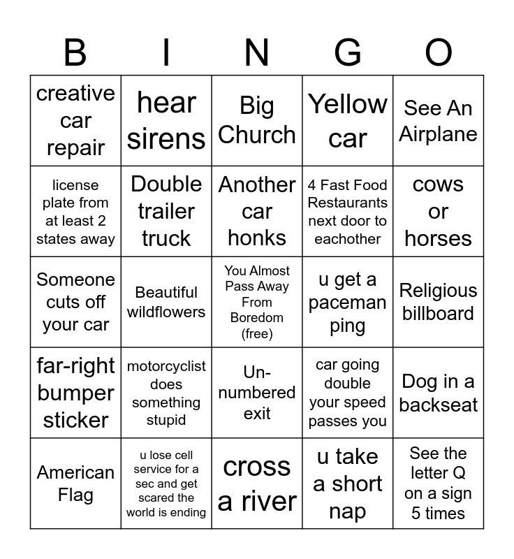 This bingo card has a free space and 24 words: motorcyclist does something stupid, u lose cell service for a sec and get scared the world is ending, Another car honks, American Flag, See An Airplane, creative car repair, license plate from at least 2 states away, hear sirens, u get a paceman ping, Un-numbered exit, 4 Fast Food Restaurants next door to eachother, Someone cuts off your car, car going double your speed passes you, Dog in a backseat, Double trailer truck, u take a short nap, Religious billboard, Big Church, cows or horses, Beautiful wildflowers, See the letter Q on a sign 5 times, far-right bumper sticker, Yellow car and cross a river.