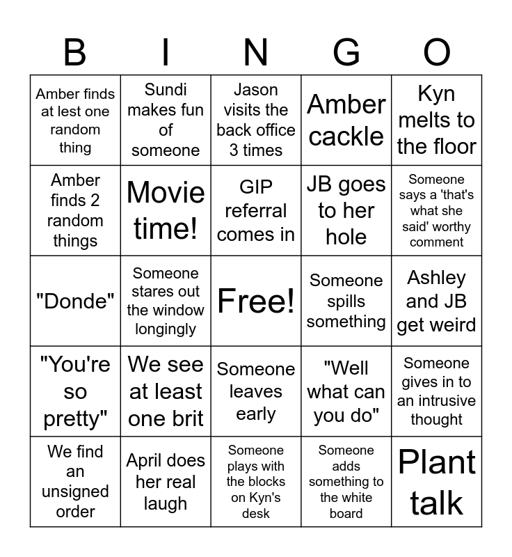 This bingo card has a free space and 24 words: We see at least one brit, April does her real laugh, GIP referral comes in, We find an unsigned order, Kyn melts to the floor, Amber finds at lest one random thing, Amber finds 2 random things, Sundi makes fun of someone, Someone spills something, Someone leaves early, JB goes to her hole, "Donde", "Well what can you do", Someone gives in to an intrusive thought, Movie time!, Someone adds something to the white board, Ashley and JB get weird, Jason visits the back office 3 times, Someone says a 'that's what she said' worthy comment, Someone stares out the window longingly, Plant talk, "You're so pretty", Amber cackle and Someone plays with the blocks on Kyn's desk.