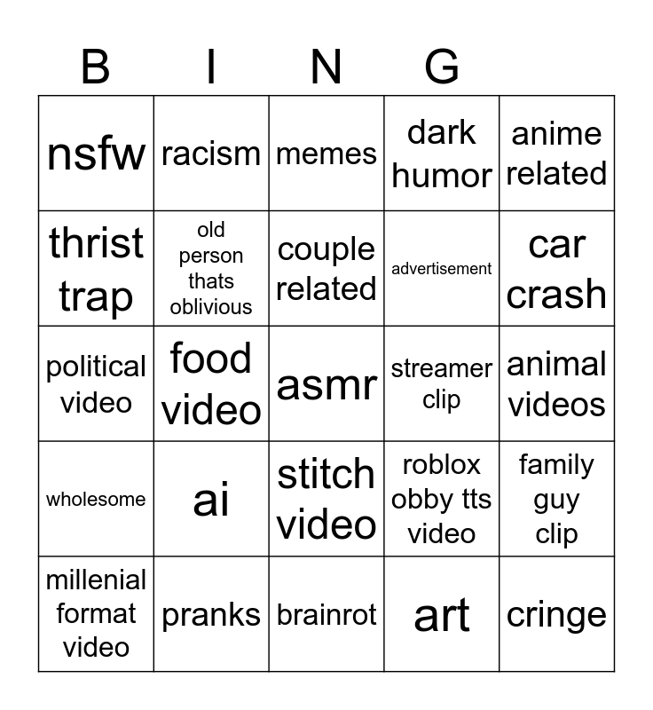 This bingo card has 25 words: ai, brainrot, couple related, millenial format video, anime related, nsfw, thrist trap, racism, streamer clip, stitch video, advertisement, political video, roblox obby tts video, family guy clip, old person thats oblivious, cringe, animal videos, memes, car crash, food video, asmr, pranks, wholesome, dark humor and art.