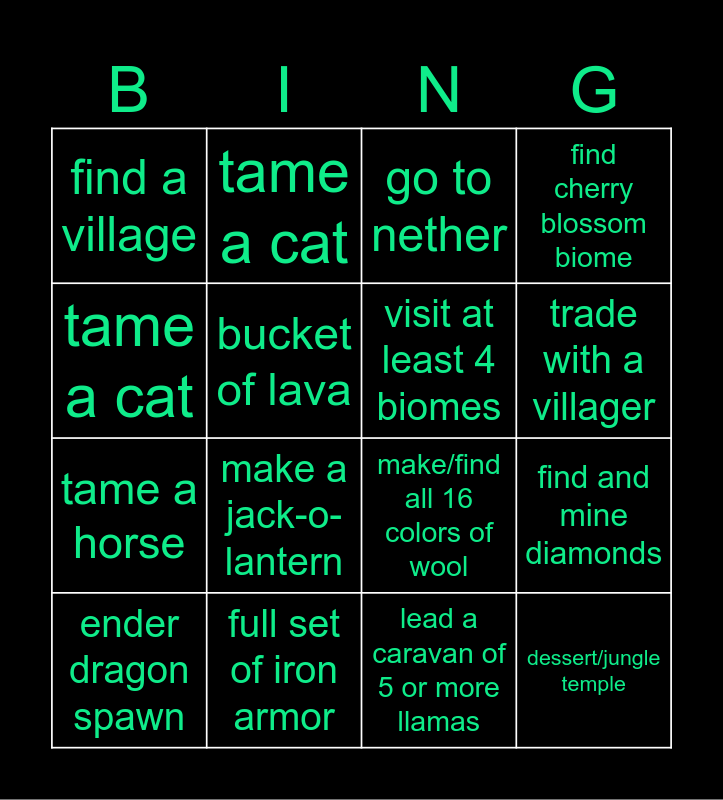 This bingo card has 16 words: full set of iron armor, find and mine diamonds, go to nether, find a village, tame a horse, tame a cat, make/find all 16 colors of wool, lead a caravan of 5 or more llamas, tame a cat, bucket of lava, ender dragon spawn, find cherry blossom biome, make a jack-o-lantern, trade with a villager, visit at least 4 biomes and dessert/jungle temple.