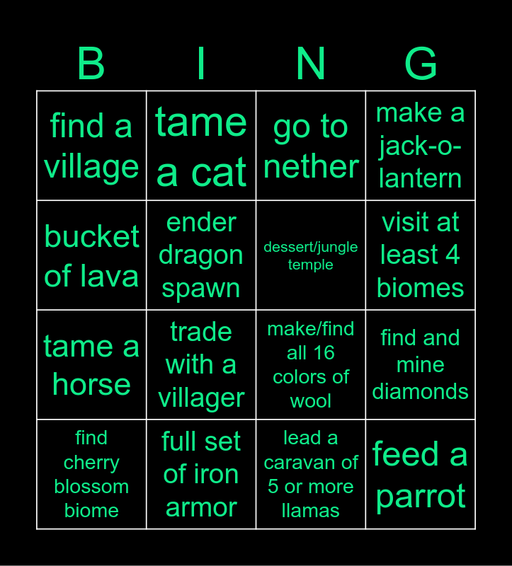 This bingo card has 16 words: full set of iron armor, find and mine diamonds, go to nether, find a village, tame a horse, tame a cat, make/find all 16 colors of wool, lead a caravan of 5 or more llamas, bucket of lava, ender dragon spawn, find cherry blossom biome, make a jack-o-lantern, trade with a villager, visit at least 4 biomes, dessert/jungle temple and feed a parrot.