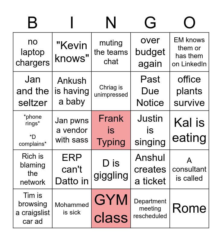 This bingo card has a free space and 24 words: ERP can't Datto in, Mohammed is sick, Chriag is unimpressed, Tim is browsing a craigslist car ad, EM knows them or has them on LinkedIn, no laptop chargers, Jan and the seltzer, "Kevin knows", Justin is singing, D is giggling, Past Due Notice, *phone rings* *D complains*, Anshul creates a ticket, A consultant is called, Ankush is having a baby, Department meeting rescheduled, Kal is eating, muting the teams chat, office plants survive, Jan pwns a vendor with sass, Rome, Rich is blaming the network, over budget again and GYM class.