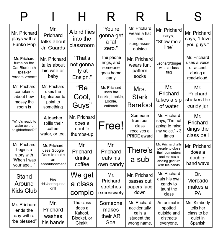 This bingo card has a free space and 63 words: Mr. Prichard tells someone to stop wandering, Mr. Prichard dings the class bell, Mr. Prichard says, “We’re going to pause right there”, Mr. Prichard takes a sip of water, Mr. Prichard drinks coffee, Mr. Prichard ends the day with a “be blessed”, Mr. Prichard talks about Jr. Guards, Mr. Prichard sneezes WAY too loud, Mr. Prichard turns on the Car Bluetooth speaker *vroom vroom*, Mr. Prichard washes his hands, Mr. Prichard uses the Lookie, Lookie, Lookie, callback, Mr. Prichard passes out papers face down, Mr. Prichard complains about how messy the room is, Mr. Prichard wears a hat and sunglasses outside, Mr. Prichard 3D Prints something, Mr. Prichard says, “Show me a line”, Mr. Prichard wears fun, pattern socks, Mr. Prichard plays with a Funko Pop, Mr. Prichard mentions that A Goofy Movie is his favorite, Mr. Prichard talks about his wife or baby, “Be Cool, Guys”, Mr. Prichard uses the Lightsaber to point to something, “You’re gonna get a fat zero.”, Mr. Prichard uses Google Docs to make an announcement, Specifically says, “Skyler, Charlie, Wes, watches outside”, Mr. Prichard tells people to close their computers and makes a closing gesture with his hands, Mr. Prichard eats his own candy, “Stop touching each other. Don’t be weird.”, Mr. Prichard says, “I’m not going to raise my voice.” - 3 times, Stand Around Kids Club, “I have been very lenient.”, Mr. Prichard stretches excessively, Mr. Prichard stops and stares for more than 30 seconds, “I’m doing this to prepare you for middle school.”, “That’s not gonna fly at Ensign.”, Mr. Prichard shakes the candy jar, Mr. Prichard eats his own candy to taunt the class, Mr. Prichard does a double thumbs-up, Mr. Prichard does a double-hand wave, Mr. Prichard says, “I love you guys.”, The phone rings, and someone goes home early, Mr. Prichard uses a voice or accent during a read-aloud., Dr. Mercado makes a PA, Someone makes a half-court basketball shot, Leonard/Singer wins a class flag, “Who’s ready to wake up the neighborhood?!”, Ms. Kimberly tells her class to be quiet in Spanish, Mrs. Stark Barefoot, The class does a Kahoot, Blooket, or Gimkit., Mr. Prichard accidentally calls a student the wrong name., An animal is spotted outside and distracts everyone., A teacher spills their coffee, water, or tea., Mr. Prichard begins a story with “When I was your age…”, Class Field Trip, Unexpected Extra Recess, A bird flies into the classroom, We get a class complo, There’s a sub, Fire drill/earthquake drill, Someone makes their AR Goal, We get a class flag, Someone from our class receives a PRIDE award and New seating chart.