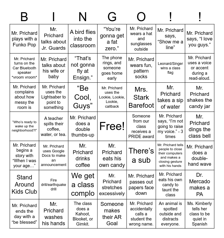 This bingo card has a free space and 63 words: Mr. Prichard tells someone to stop wandering, Mr. Prichard dings the class bell, Mr. Prichard says, “We’re going to pause right there”, Mr. Prichard takes a sip of water, Mr. Prichard drinks coffee, Mr. Prichard ends the day with a “be blessed”, Mr. Prichard talks about Jr. Guards, Mr. Prichard sneezes WAY too loud, Mr. Prichard turns on the Car Bluetooth speaker *vroom vroom*, Mr. Prichard washes his hands, Mr. Prichard uses the Lookie, Lookie, Lookie, callback, Mr. Prichard passes out papers face down, Mr. Prichard complains about how messy the room is, Mr. Prichard wears a hat and sunglasses outside, Mr. Prichard 3D Prints something, Mr. Prichard says, “Show me a line”, Mr. Prichard wears fun, pattern socks, Mr. Prichard plays with a Funko Pop, Mr. Prichard mentions that A Goofy Movie is his favorite, Mr. Prichard talks about his wife or baby, “Be Cool, Guys”, Mr. Prichard uses the Lightsaber to point to something, “You’re gonna get a fat zero.”, Mr. Prichard uses Google Docs to make an announcement, Specifically says, “Skyler, Charlie, Wes, watches outside”, Mr. Prichard tells people to close their computers and makes a closing gesture with his hands, Mr. Prichard eats his own candy, “Stop touching each other. Don’t be weird.”, Mr. Prichard says, “I’m not going to raise my voice.” - 3 times, Stand Around Kids Club, “I have been very lenient.”, Mr. Prichard stretches excessively, Mr. Prichard stops and stares for more than 30 seconds, “I’m doing this to prepare you for middle school.”, “That’s not gonna fly at Ensign.”, Mr. Prichard shakes the candy jar, Mr. Prichard eats his own candy to taunt the class, Mr. Prichard does a double thumbs-up, Mr. Prichard does a double-hand wave, Mr. Prichard says, “I love you guys.”, The phone rings, and someone goes home early, Mr. Prichard uses a voice or accent during a read-aloud., Dr. Mercado makes a PA, Someone makes a half-court basketball shot, Leonard/Singer wins a class flag, “Who’s ready to wake up the neighborhood?!”, Ms. Kimberly tells her class to be quiet in Spanish, Mrs. Stark Barefoot, The class does a Kahoot, Blooket, or Gimkit., Mr. Prichard accidentally calls a student the wrong name., An animal is spotted outside and distracts everyone., A teacher spills their coffee, water, or tea., Mr. Prichard begins a story with “When I was your age…”, Class Field Trip, Unexpected Extra Recess, A bird flies into the classroom, We get a class complo, There’s a sub, Fire drill/earthquake drill, Someone makes their AR Goal, We get a class flag, Someone from our class receives a PRIDE award and New seating chart.