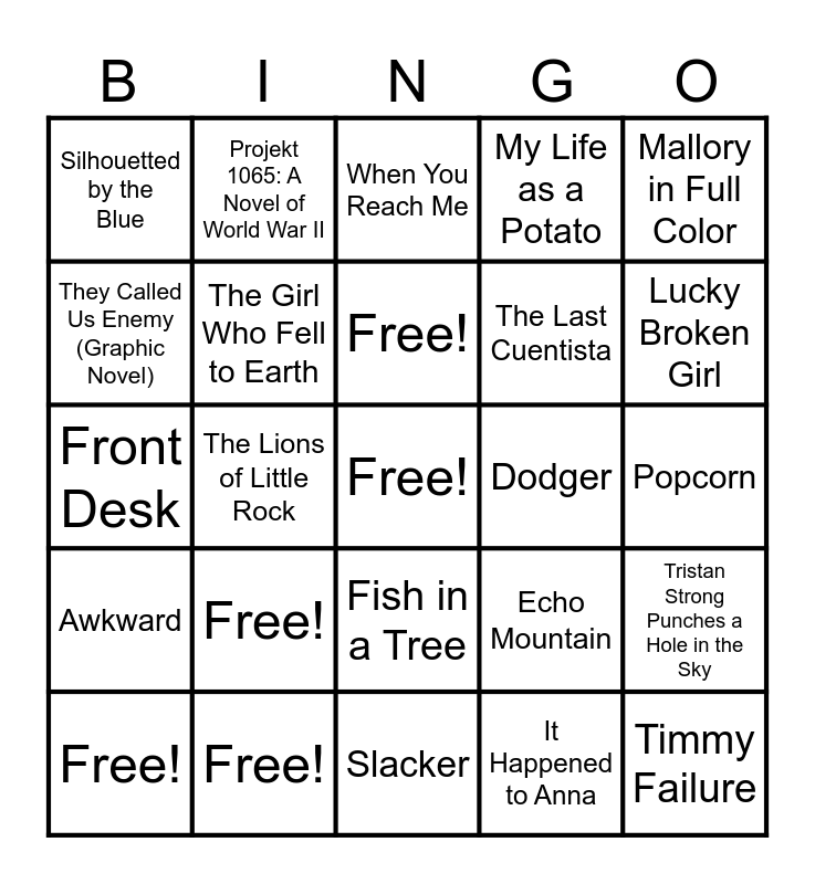 This bingo card has a free space and 24 words: Free!, Free!, Free!, Free!, Mallory in Full Color, Silhouetted by the Blue, They Called Us Enemy (Graphic Novel), Projekt 1065: A Novel of World War II, Dodger, Fish in a Tree, The Last Cuentista, Front Desk, Echo Mountain, Tristan Strong Punches a Hole in the Sky, The Girl Who Fell to Earth, It Happened to Anna, Popcorn, When You Reach Me, Lucky Broken Girl, The Lions of Little Rock, Timmy Failure, Awkward, My Life as a Potato and Slacker.