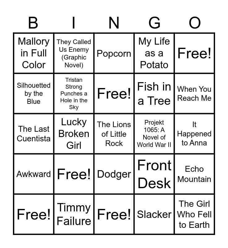 This bingo card has 25 words: Free!, Free!, Free!, Free!, Free!, Mallory in Full Color, Silhouetted by the Blue, They Called Us Enemy (Graphic Novel), Projekt 1065: A Novel of World War II, Dodger, Fish in a Tree, The Last Cuentista, Front Desk, Echo Mountain, Tristan Strong Punches a Hole in the Sky, The Girl Who Fell to Earth, It Happened to Anna, Popcorn, When You Reach Me, Lucky Broken Girl, The Lions of Little Rock, Timmy Failure, Awkward, My Life as a Potato and Slacker.