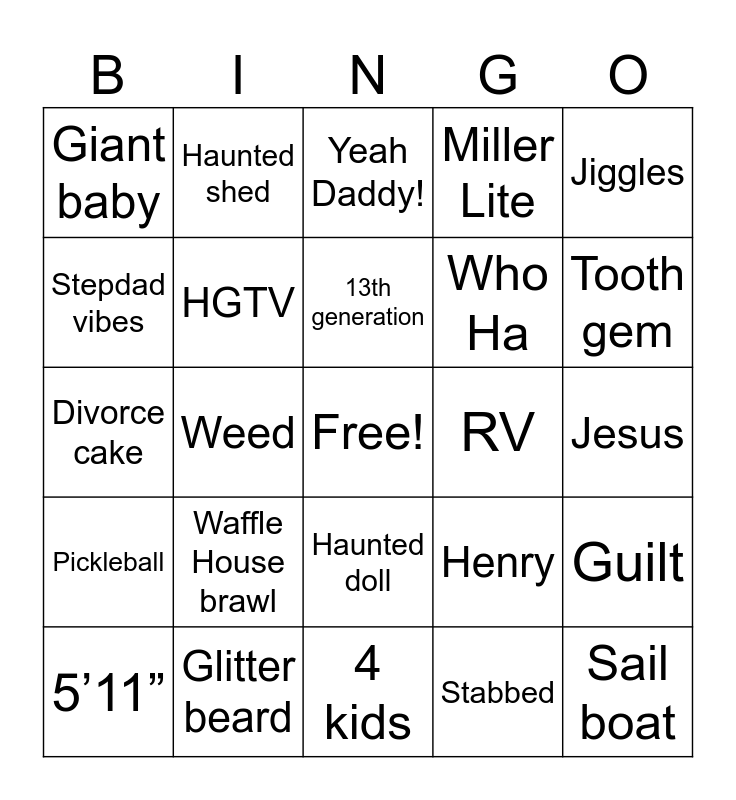 This bingo card has a free space and 55 words: Basketball, 5’11”, Latex, Giant baby, 4 kids, Body pillow, HGTV, Bi Polar Boomer, Who Ha, Little Daisies, Miller Lite, Swingers, Hurricane, Bachelorette parties, Clown shoes, Rest areas, Jiggles, Weed, Weed dealer, Sail boat, RV, Harley, Henry, Yeah Daddy!, My Buddy Russell, 13th generation, Stabbed, Rally, Jesus, Guilt, Yard sale, Air fryer, Glitter bomb, Moon boots, Stepdad vibes, Divorce cake, Gator farm, Pickleball, Church van, Gas station sushi, Haunted shed, PTO mom, Nascar brunch, Emotional support possum, Waffle House brawl, Glitter beard, Fantasy football, Goat yoga, Beer pong champion, Tooth gem, Unlicensed tattoo, Awkward cousin, Croc charm, Haunted doll and TikTok preacher.