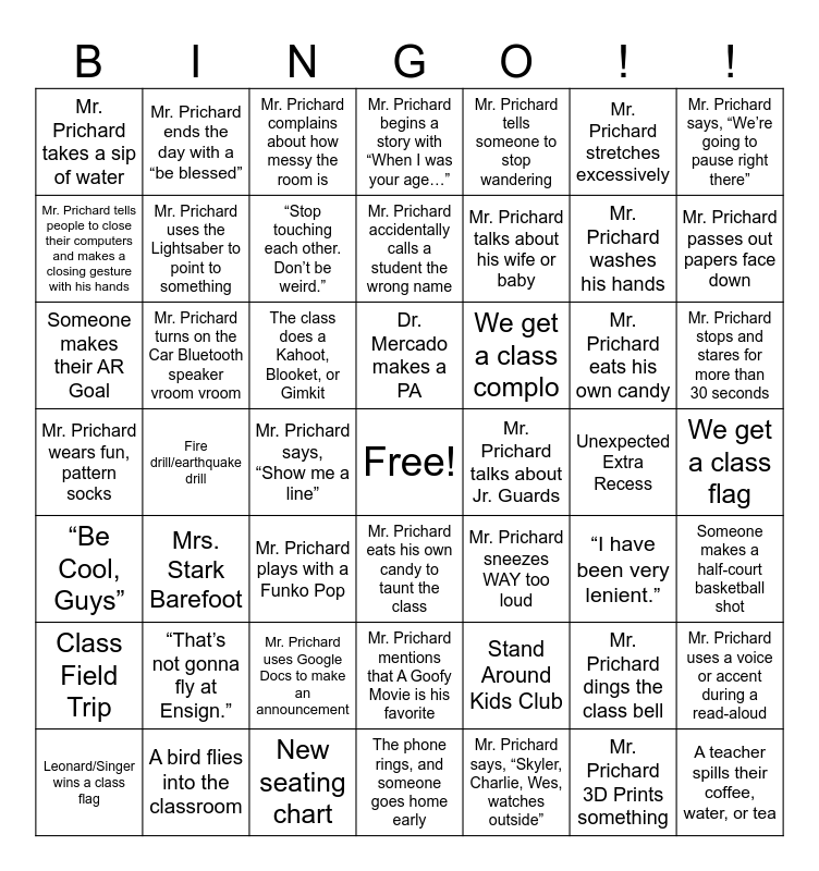 This bingo card has a free space and 61 words: Mr. Prichard drinks coffee, Mr. Prichard wears fun, pattern socks, Mr. Prichard wears a hat and sunglasses outside, Mr. Prichard turns on the Car Bluetooth speaker vroom vroom, Mr. Prichard says, “Show me a line”, Mr. Prichard dings the class bell, Mr. Prichard says, “We’re going to pause right there”, Mr. Prichard uses the Lookie, Lookie, Lookie, callback, Mr. Prichard uses the Lightsaber to point to something, Mr. Prichard uses a voice or accent during a read-aloud, Mr. Prichard begins a story with “When I was your age…”, Mr. Prichard uses Google Docs to make an announcement, Mr. Prichard stretches excessively, Mr. Prichard plays with a Funko Pop, Mr. Prichard 3D Prints something, Mr. Prichard takes a sip of water, Mr. Prichard washes his hands, Mr. Prichard tells someone to stop wandering, Mr. Prichard says, “I’m not going to raise my voice.” – 3 times, Mr. Prichard tells people to close their computers and makes a closing gesture with his hands, Mr. Prichard passes out papers face down, Mr. Prichard complains about how messy the room is, Mr. Prichard stops and stares for more than 30 seconds, Mr. Prichard eats his own candy, Mr. Prichard shakes the candy jar, Mr. Prichard eats his own candy to taunt the class, “Be Cool, Guys”, “You’re gonna get a fat zero.”, “Stop touching each other. Don’t be weird.”, “I have been very lenient.”, “I’m doing this to prepare you for middle school.”, “That’s not gonna fly at Ensign.”, Mr. Prichard says, “Skyler, Charlie, Wes, watches outside”, Mr. Prichard says, “I love you guys.”, Mr. Prichard ends the day with a “be blessed”, Mr. Prichard talks about Jr. Guards, Mr. Prichard mentions that A Goofy Movie is his favorite, Mr. Prichard talks about his wife or baby, Mr. Prichard sneezes WAY too loud, Mr. Prichard accidentally calls a student the wrong name, Stand Around Kids Club, The class does a Kahoot, Blooket, or Gimkit, Someone makes their AR Goal, Someone from our class receives a PRIDE award, We get a class complo, We get a class flag, Leonard/Singer wins a class flag, New seating chart, The phone rings, and someone goes home early, Dr. Mercado makes a PA, Fire drill/earthquake drill, There’s a sub, Class Field Trip, Unexpected Extra Recess, Ms. Kimberly tells her class to be quiet in Spanish, Mrs. Stark Barefoot, Someone makes a half-court basketball shot, A bird flies into the classroom, An animal is spotted outside and distracts everyone, A teacher spills their coffee, water, or tea and “Who’s ready to wake up the neighborhood?!”.