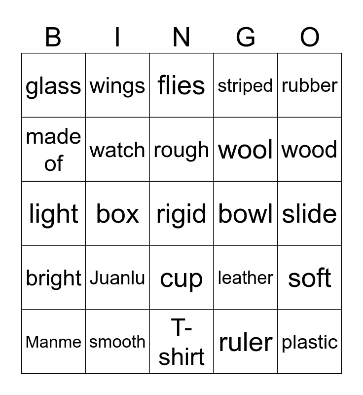 This bingo card has a free space and 24 words: Juanlu, smooth, rough, Manme, rubber, glass, made of, wings, bowl, cup, wool, light, leather, soft, watch, ruler, slide, flies, wood, box, plastic, bright, striped and T-shirt.