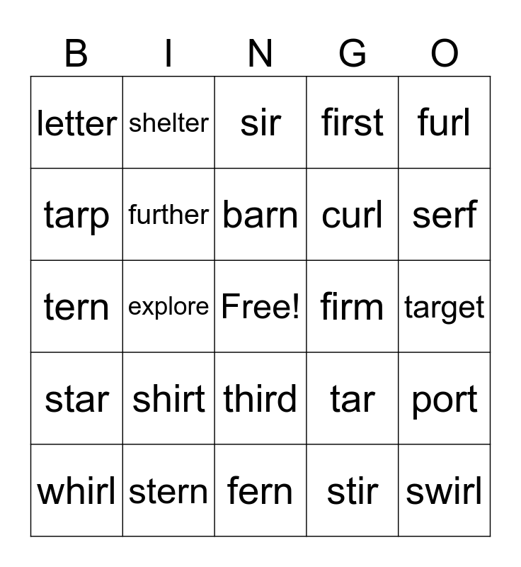 This bingo card has a free space and 45 words: hurt, swirl, twirl, whirl, girl, stir, sir, hurl, furl, stern, first, firm, third, shirt, skirt, fern, term, tern, verb, serf, shelter, confirm, sister, letter, better, target, garden, bar, tar, star, short, port, sport, fork, fort, explore, corn, born, birth, barn, tarp, curl, burst, further and spur.