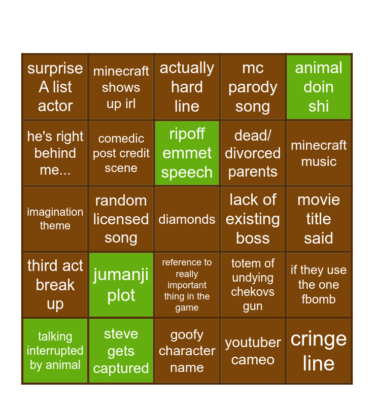 This bingo card has a free space and 24 words: jumanji plot, steve gets captured, ripoff emmet speech, talking interrupted by animal, animal doin shi, surprise A list actor, he's right behind me..., minecraft shows up irl, lack of existing boss, reference to really important thing in the game, dead/ divorced parents, imagination theme, totem of undying chekovs gun, if they use the one fbomb, comedic post credit scene, youtuber cameo, movie title said, actually hard line, minecraft music, random licensed song, cringe line, third act break up, mc parody song and goofy character name.