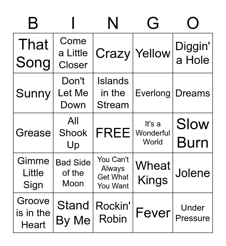 This bingo card has a free space and 39 words: Stayin' Alive, Wish I Knew You, Hey Ya!, Don't Let Me Down, Groove is in the Heart, You Can't Always Get What You Want, Islands in the Stream, Thunderstruck, Diggin' a Hole, Gimme Little Sign, All Shook Up, Yellow, Under Pressure, Slow Burn, It's a Wonderful World, Bad Side of the Moon, All these Things I've Done, That Song, Tighten Up, Wheat Kings, Sunny, Rockin' Robin, Everlong, Dreams, Dancing Queen, Uptown Girl, Country Roads, Respect, Breezeblocks, Come a Little Closer, Don't Go Breaking My Heart, I Will Survive, Crazy, Stand By Me, Fever, Jump Around, Jolene, Grease and Sitting, Waiting, Wishing.