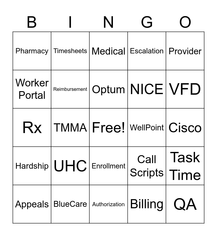 This bingo card has a free space and 29 words: Appeals, MATS, TMMA, TennCare, Pharmacy, Medical, Reimbursement, UHC, WellPoint, BlueCare, Cisco, QA, Authorization, Billing, VFD, MCC Change, Enrollment, Hardship, Provider, Rx, Call Scripts, Add'tl Info, NICE, Worker Portal, Escalation, Timesheets, Task Time, Optum and FriYAY.