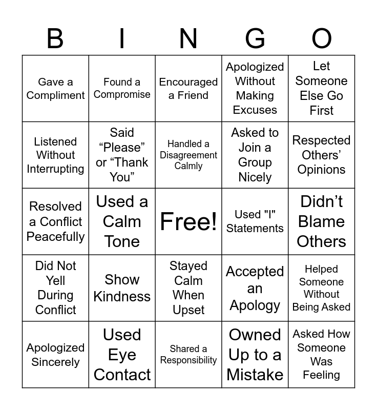 This bingo card has a free space and 24 words: Show Kindness, Used Eye Contact, Handled a Disagreement Calmly, Apologized Sincerely, Let Someone Else Go First, Gave a Compliment, Listened Without Interrupting, Found a Compromise, Used "I" Statements, Stayed Calm When Upset, Asked to Join a Group Nicely, Resolved a Conflict Peacefully, Accepted an Apology, Helped Someone Without Being Asked, Said “Please” or “Thank You”, Owned Up to a Mistake, Didn’t Blame Others, Encouraged a Friend, Respected Others’ Opinions, Used a Calm Tone, Asked How Someone Was Feeling, Did Not Yell During Conflict, Apologized Without Making Excuses and Shared a Responsibility.