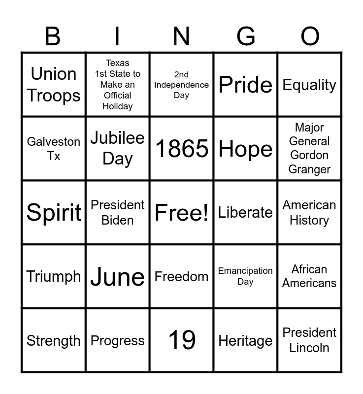 This bingo card has a free space and 25 words: June, 19, 1865, Strength, Equality, Union Troops, Galveston Tx, Texas 1st State to Make an Official Holiday, Liberate, Freedom, Hope, Spirit, Emancipation Day, African Americans, Jubilee Day, Federal Holiday, American History, 2nd Independence Day, Major General Gordon Granger, President Biden, President Lincoln, Progress, Triumph, Pride and Heritage.