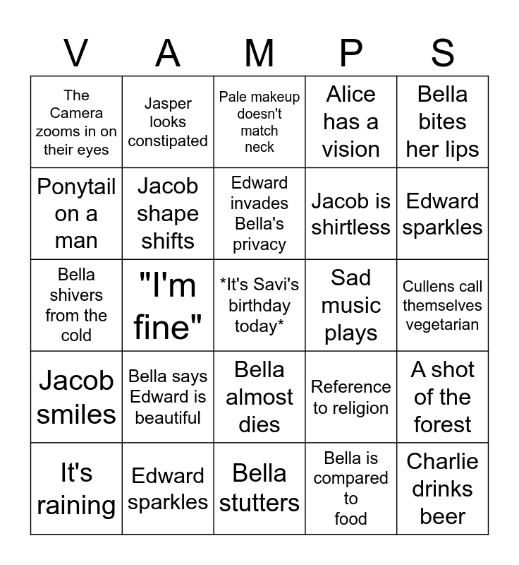 This bingo card has a free space and 24 words: Bella says Edward is beautiful, Edward sparkles, Edward invades Bella's privacy, It's raining, Bella bites her lips, The Camera zooms in on their eyes, Ponytail on a man, Jasper looks constipated, Sad music plays, Bella almost dies, Jacob is shirtless, Bella shivers from the cold, Reference to religion, A shot of the forest, Jacob shape shifts, Bella is compared to food, Cullens call themselves vegetarian, Pale makeup doesn't match neck, Edward sparkles, "I'm fine", Charlie drinks beer, Jacob smiles, Alice has a vision and Bella stutters.