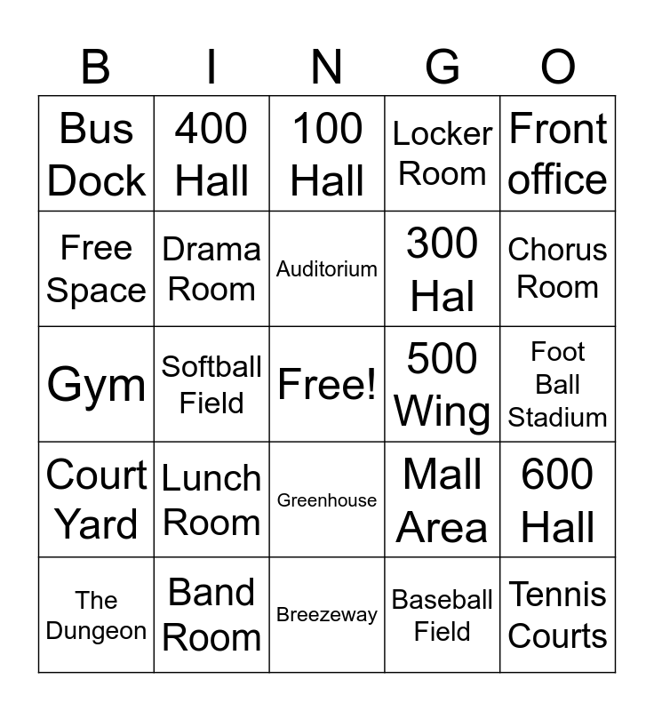 This bingo card has a free space and 27 words: Mall Area, 200 Hall, 300 Hal, Breezeway, Free Space, 100 Hall, 400 Hall, Court Yard, 500 Wing, 600 Hall, Gym, Locker Room, The Dungeon, Band Room, Chorus Room, Art Room, Drama Room, Auditorium, Lunch Room, Bus Dock, Foot Ball Stadium, Baseball Field, Softball Field, Tennis Courts, Greenhouse, Front office and Counselor Suites.