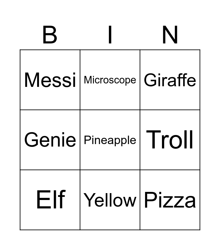 This bingo card has a free space and 8 words: Troll, Giraffe, Microscope, Elf, Messi, Pizza, Genie and Yellow.