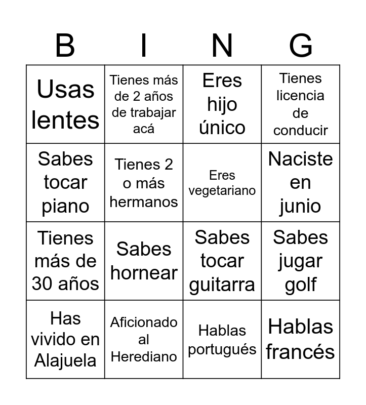 This bingo card has 16 words: Aficionado al Herediano, Sabes jugar golf, Eres hijo único, Usas lentes, Tienes más de 30 años, Tienes más de 2 años de trabajar acá, Sabes tocar guitarra, Hablas portugués, Sabes tocar piano, Tienes 2 o más hermanos, Has vivido en Alajuela, Tienes licencia de conducir, Sabes hornear, Naciste en junio, Eres vegetariano and Hablas francés.