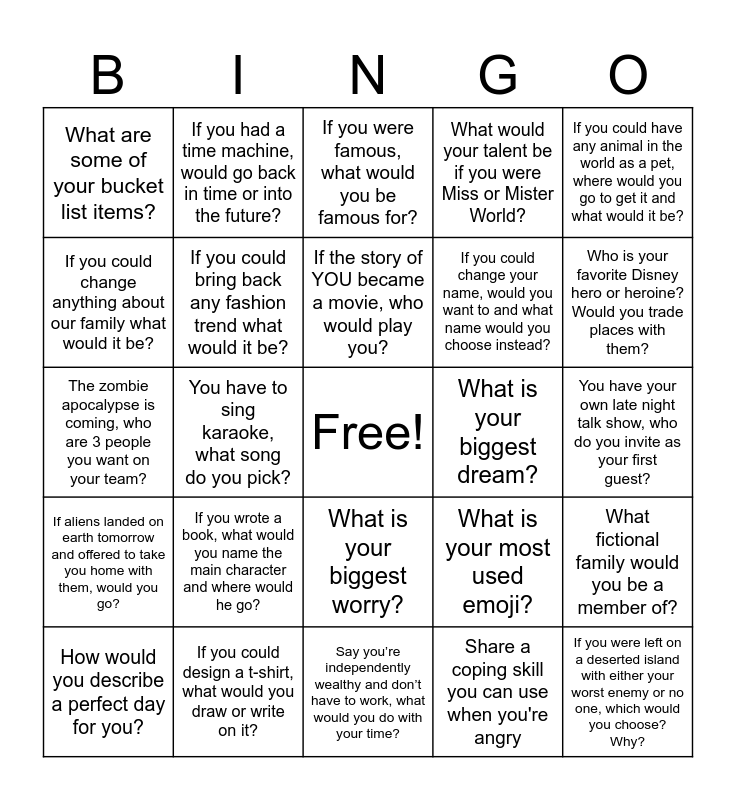 This bingo card has a free space and 24 words: If you wrote a book, what would you name the main character and where would he go?, If you could design a t-shirt, what would you draw or write on it?, If the story of YOU became a movie, who would play you?, How would you describe a perfect day for you?, If you could have any animal in the world as a pet, where would you go to get it and what would it be?, What are some of your bucket list items?, If you could change anything about our family what would it be?, If you had a time machine, would go back in time or into the future?, What is your biggest dream?, What is your biggest worry?, If you could change your name, would you want to and what name would you choose instead?, The zombie apocalypse is coming, who are 3 people you want on your team?, What is your most used emoji?, What fictional family would you be a member of?, If you could bring back any fashion trend what would it be?, Share a coping skill you can use when you're angry, You have your own late night talk show, who do you invite as your first guest?, If you were famous, what would you be famous for?, Who is your favorite Disney hero or heroine? Would you trade places with them?, You have to sing karaoke, what song do you pick?, If you were left on a deserted island with either your worst enemy or no one, which would you choose? Why?, If aliens landed on earth tomorrow and offered to take you home with them, would you go?, What would your talent be if you were Miss or Mister World? and Say you’re independently wealthy and don’t have to work, what would you do with your time?.