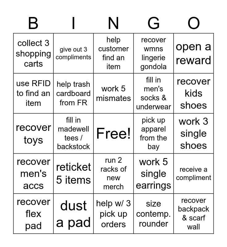 This bingo card has a free space and 24 words: recover flex pad, reticket 5 items, work 5 mismates, size contemp. rounder, open a reward, collect 3 shopping carts, give out 3 compliments, help customer find an item, pick up apparel from the bay, work 3 single shoes, recover toys, help trash cardboard from FR, work 5 single earrings, receive a compliment, use RFID to find an item, dust a pad, help w/ 3 pick up orders, recover wmns lingerie gondola, recover kids shoes, recover men's accs, fill in madewell tees / backstock, run 2 racks of new merch, fill in men's socks & underwear and recover backpack & scarf wall.