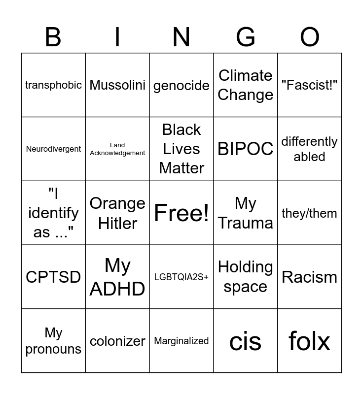 This bingo card has a free space and 39 words: Indigenous, Safe Space, My Truth, Land Acknowledgement, My pronouns, LGBTQIA2S+, Black Lives Matter, "Nazi!", "Fascist!", CPTSD, Orange Hitler, Climate Change, folx, they/them, My Trauma, My ADHD, ableist, transphobic, Latinx, Holding space, Neurodivergent, Marginalized, BIPOC, differently abled, Chackras, Vegan, Apartheid state, Trans women are women, ACAB, Mussolini, Occupied lands, Palestine, genocide, colonizer, cis, oppression, Racism, "I identify as ..." and #metoo.