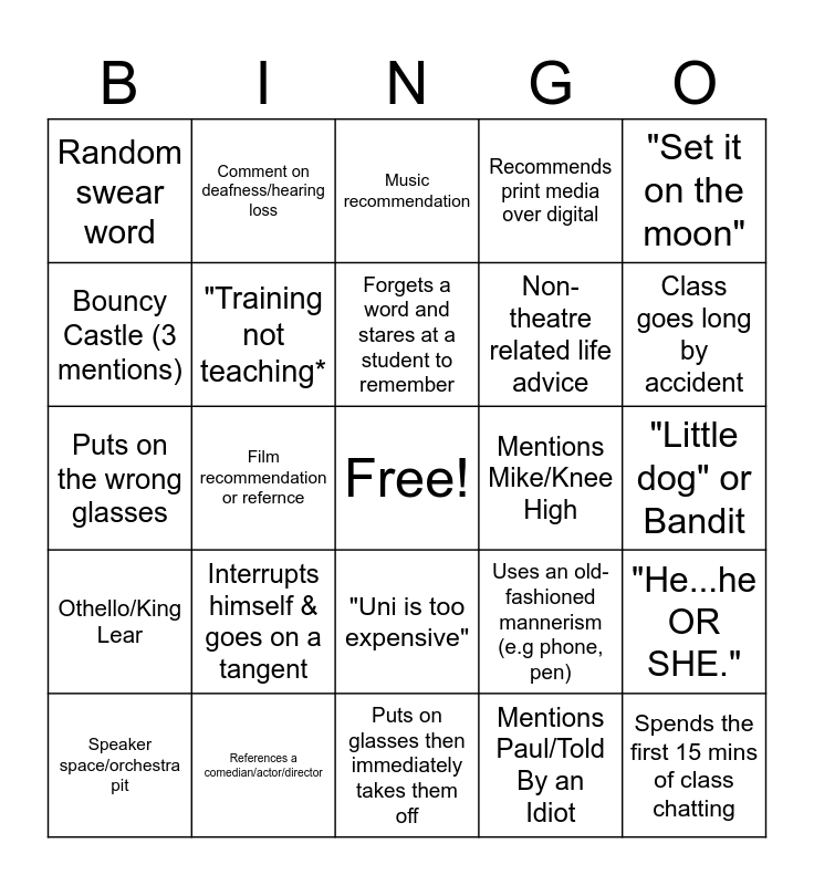 This bingo card has a free space and 24 words: Interrupts himself & goes on a tangent, References a comedian/actor/director, Forgets a word and stares at a student to remember, Speaker space/orchestra pit, "Set it on the moon", Random swear word, Bouncy Castle (3 mentions), Comment on deafness/hearing loss, Mentions Mike/Knee High, "Uni is too expensive", Non-theatre related life advice, Puts on the wrong glasses, Uses an old-fashioned mannerism (e.g phone, pen), "He...he OR SHE.", "Training not teaching*, Mentions Paul/Told By an Idiot, "Little dog" or Bandit, Music recommendation, Class goes long by accident, Film recommendation or refernce, Spends the first 15 mins of class chatting, Othello/King Lear, Recommends print media over digital and Puts on glasses then immediately takes them off.