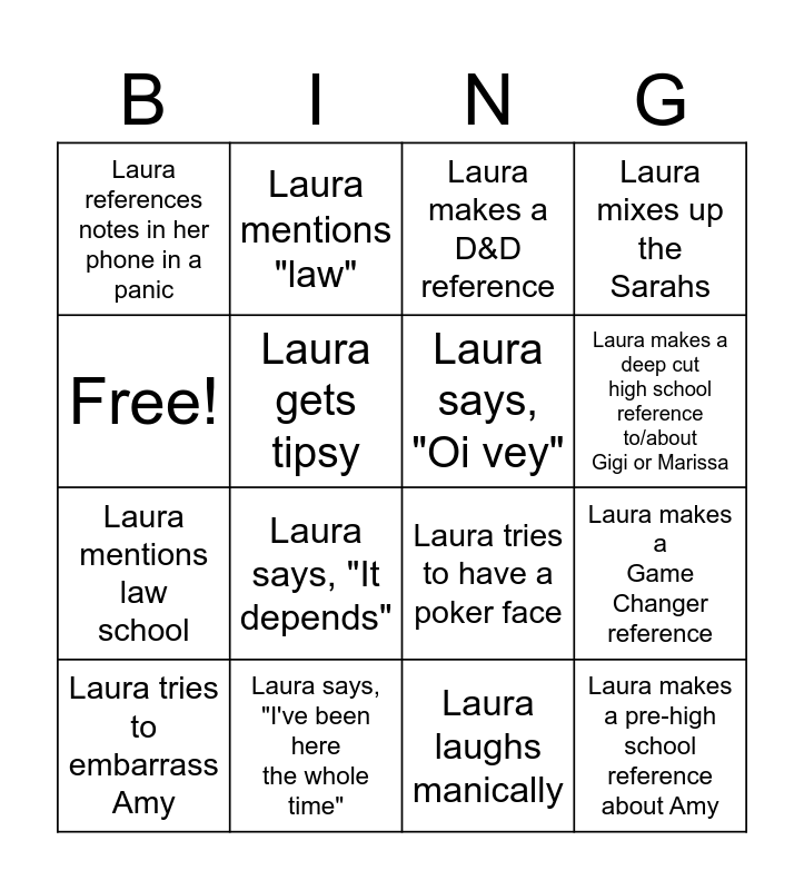 This bingo card has 16 words: Laura says, "I've been here the whole time", Laura makes a Game Changer reference, Laura makes a D&D reference, Laura references notes in her phone in a panic, Laura mentions law school, Laura mentions "law", Laura tries to have a poker face, Laura laughs manically, Free!, Laura gets tipsy, Laura tries to embarrass Amy, Laura mixes up the Sarahs, Laura says, "It depends", Laura makes a deep cut high school reference to/about Gigi or Marissa, Laura says, "Oi vey" and Laura makes a pre-high school reference about Amy.