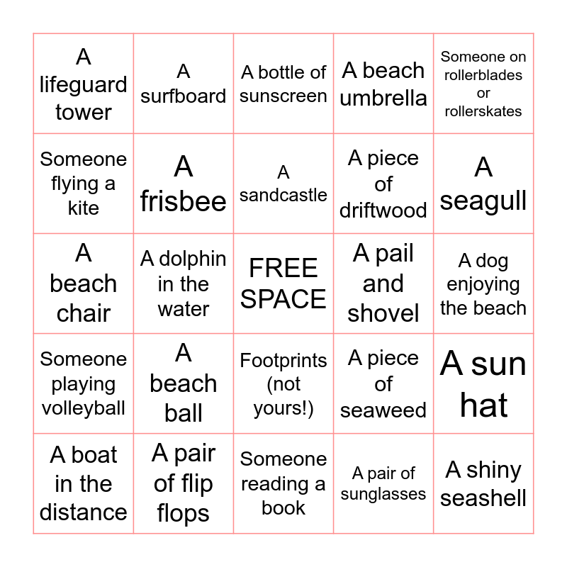 This bingo card has a free space and 24 words: A beach ball, A pair of flip flops, A sandcastle, A boat in the distance, Someone on rollerblades or rollerskates, A lifeguard tower, Someone flying a kite, A surfboard, A pail and shovel, Footprints (not yours!), A piece of driftwood, A beach chair, A piece of seaweed, A sun hat, A frisbee, A pair of sunglasses, A dog enjoying the beach, A bottle of sunscreen, A seagull, A dolphin in the water, A shiny seashell, Someone playing volleyball, A beach umbrella and Someone reading a book.