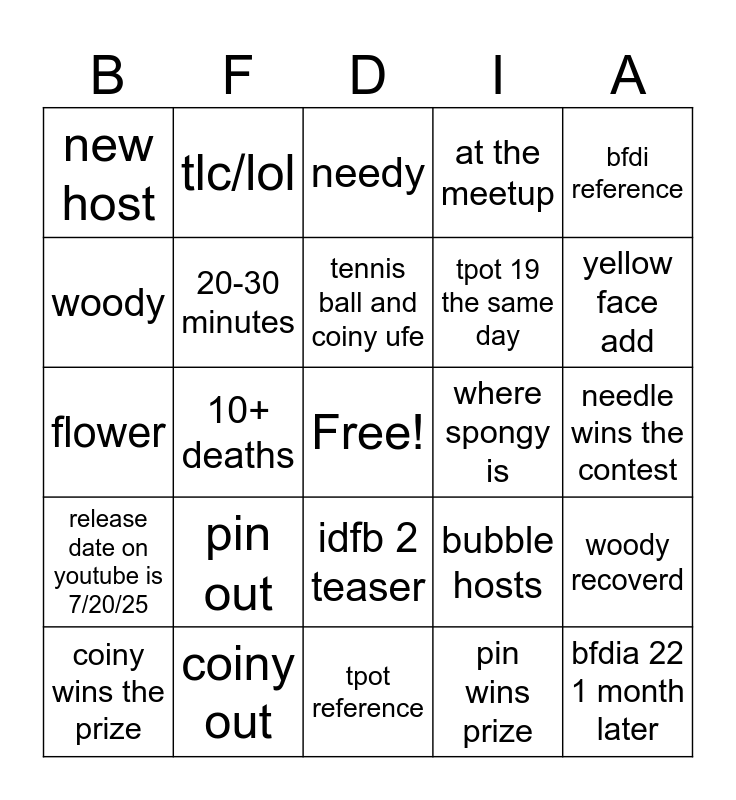 This bingo card has a free space and 24 words: pin out, coiny out, tennis ball and coiny ufe, coiny wins the prize, bfdi reference, new host, woody, tlc/lol, where spongy is, idfb 2 teaser, tpot 19 the same day, flower, bubble hosts, woody recoverd, 20-30 minutes, pin wins prize, needle wins the contest, needy, yellow face add, 10+ deaths, bfdia 22 1 month later, release date on youtube is 7/20/25, at the meetup and tpot reference.