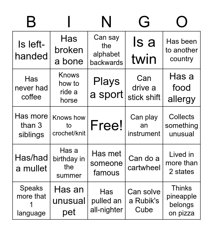 This bingo card has a free space and 24 words: Has a birthday in the summer, Has an unusual pet, Plays a sport, Speaks more that 1 language, Has been to another country, Is left-handed, Has never had coffee, Has broken a bone, Can play an instrument, Has met someone famous, Can drive a stick shift, Has more than 3 siblings, Can do a cartwheel, Lived in more than 2 states, Knows how to ride a horse, Can solve a Rubik's Cube, Collects something unusual, Can say the alphabet backwards, Has a food allergy, Knows how to crochet/knit, Thinks pineapple belongs on pizza, Has/had a mullet, Is a twin and Has pulled an all-nighter.
