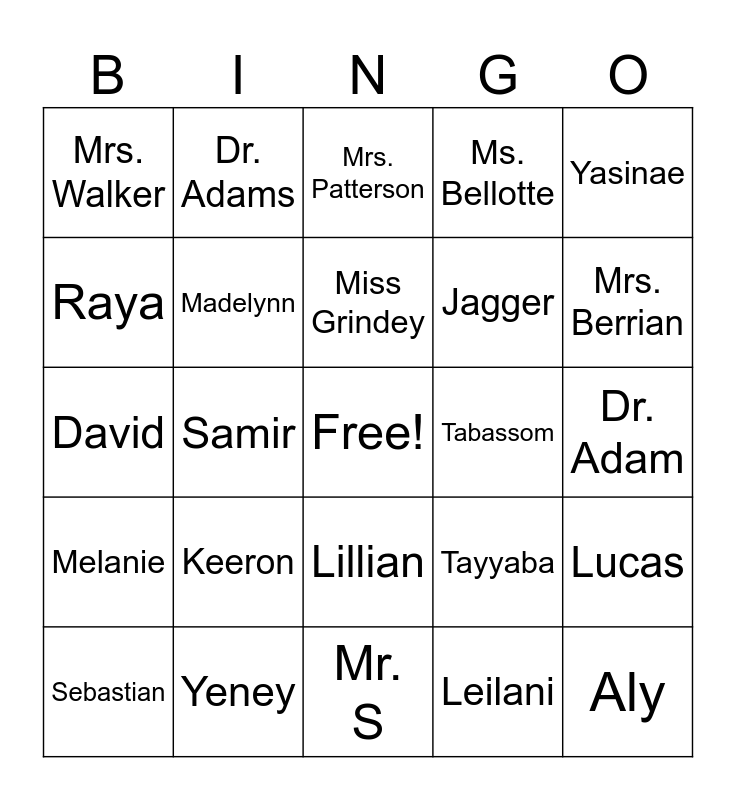 This bingo card has a free space and 24 words: Keeron, Yeney, Miss Grindey, Sebastian, Yasinae, Mrs. Walker, Raya, Dr. Adams, Tabassom, Lillian, Jagger, David, Tayyaba, Lucas, Madelynn, Leilani, Dr. Adam, Mrs. Patterson, Mrs. Berrian, Samir, Aly, Melanie, Ms. Bellotte and Mr. S.