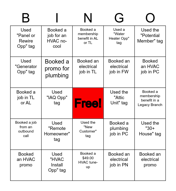 This bingo card has a free space and 24 words: Booked an HVAC promo, Used "Remote Homeowner" tag, Booked an electrical job in TL, Booked an electrical job in PN, Used the "Potential Member" tag, Used "Panel or Rewire Opp" tag, Booked a job for an HVAC no-cool, Booked a membership benefit in AL or TL, Used the "Attic Unit" tag, Booked a membership benefit in a Legacy Branch, Booked a job in TL or AL, Booked a promo for plumbing, Booked a plumbing job in PC, Used the "30+ House" tag, Used "Generator Opp" tag, Used "HVAC Install Opp" tag, Booked a $49.00 HVAC tune-up, Used a "Water Heater Opp" tag, Booked an HVAC job in PC, Booked a job from an outbound call, Used "IAQ Opp" tag, Used the "New Customer" tag, Booked an electrical job in FW and Booked an electrical promo.
