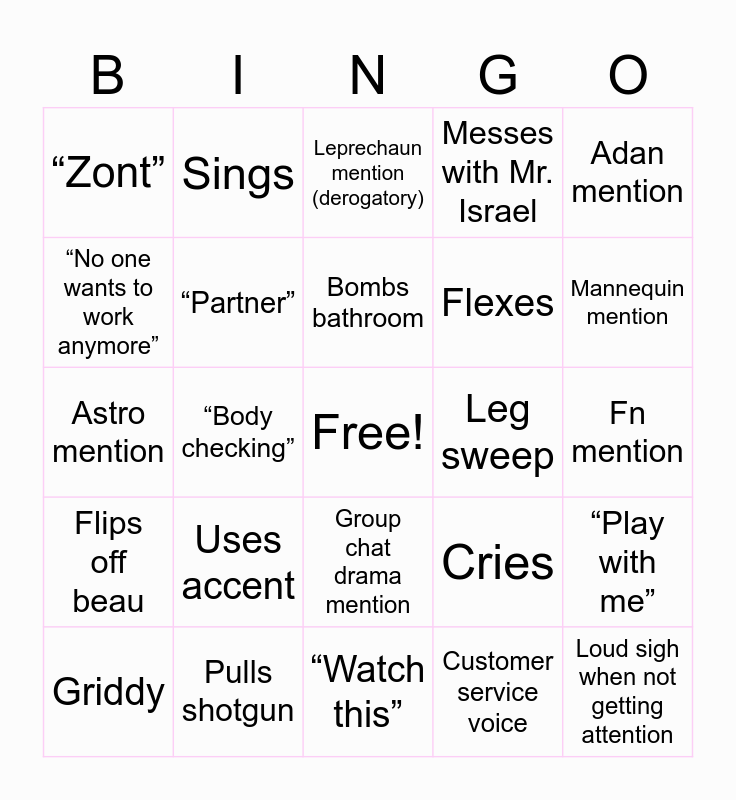 This bingo card has a free space and 24 words: Uses accent, Pulls shotgun, Bombs bathroom, Griddy, Adan mention, “Zont”, “No one wants to work anymore”, Sings, Leg sweep, Group chat drama mention, Flexes, Astro mention, Cries, “Play with me”, “Partner”, Customer service voice, Fn mention, Leprechaun mention (derogatory), Mannequin mention, “Body checking”, Loud sigh when not getting attention, Flips off beau, Messes with Mr. Israel and “Watch this”.