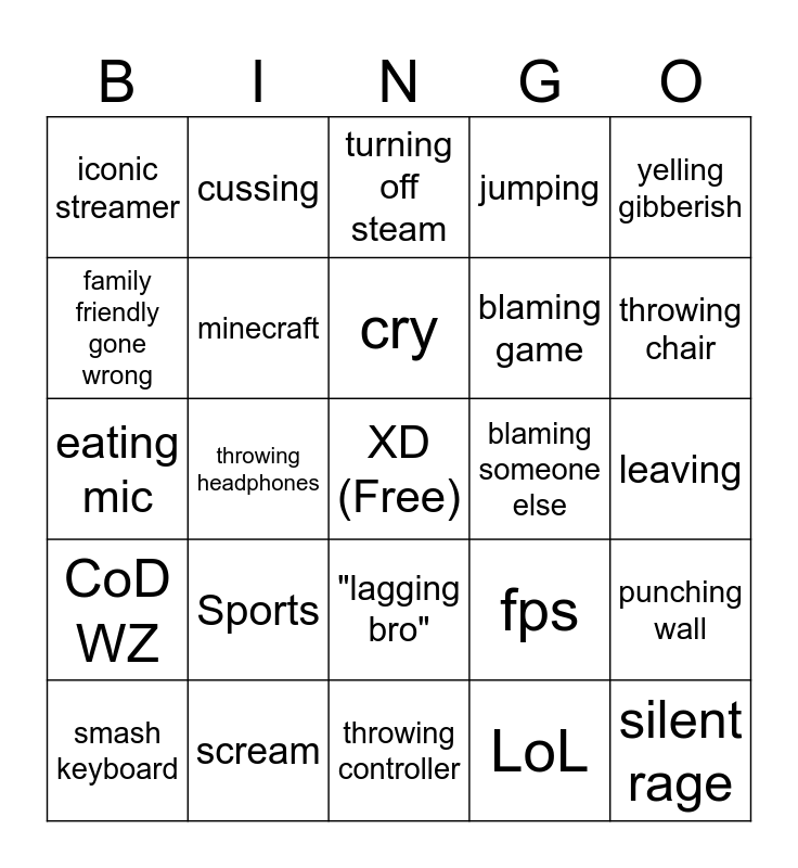 This bingo card has a free space and 24 words: Sports, scream, cry, smash keyboard, yelling gibberish, iconic streamer, family friendly gone wrong, cussing, blaming someone else, "lagging bro", blaming game, eating mic, fps, punching wall, minecraft, LoL, leaving, turning off steam, throwing chair, throwing headphones, silent rage, CoD WZ, jumping and throwing controller.